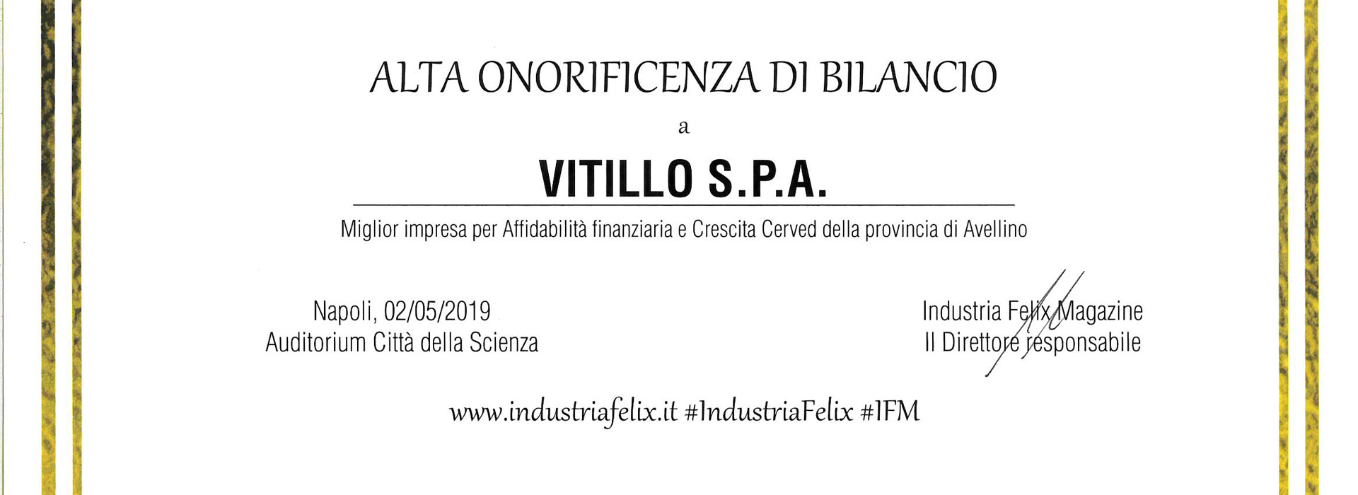 La Vitillo è stata insignita del Premio Industria Felix come “Miglior impresa per affidabilità finanziaria e crescita Cerved della provincia di Avellino“.